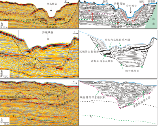 图1 台湾东部海域峡谷体系上游-中游-下游沉积特征