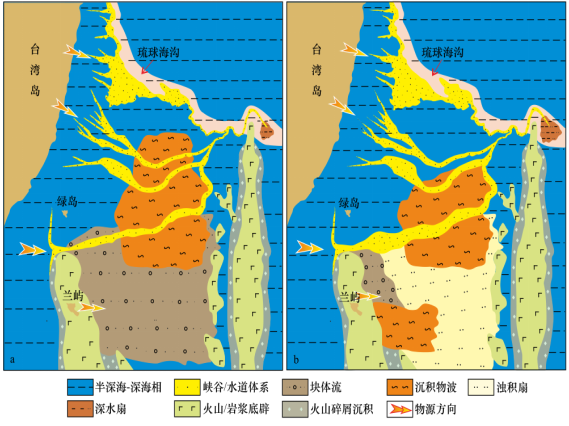 图2 台湾东部海域上新世(a)和第四纪(b)沉积相平面展布