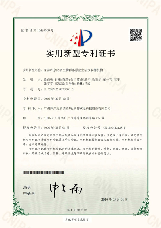 近期,由广州海洋地质调查局天然气水合物工程技术中心申请的“一种海底沉积物剖面孔隙水原位采集单元”、“深海冷泉底栖生物群落原位生活水取样机构”2项实用新型专利顺利通过国家知识产权局审核并获得授权。