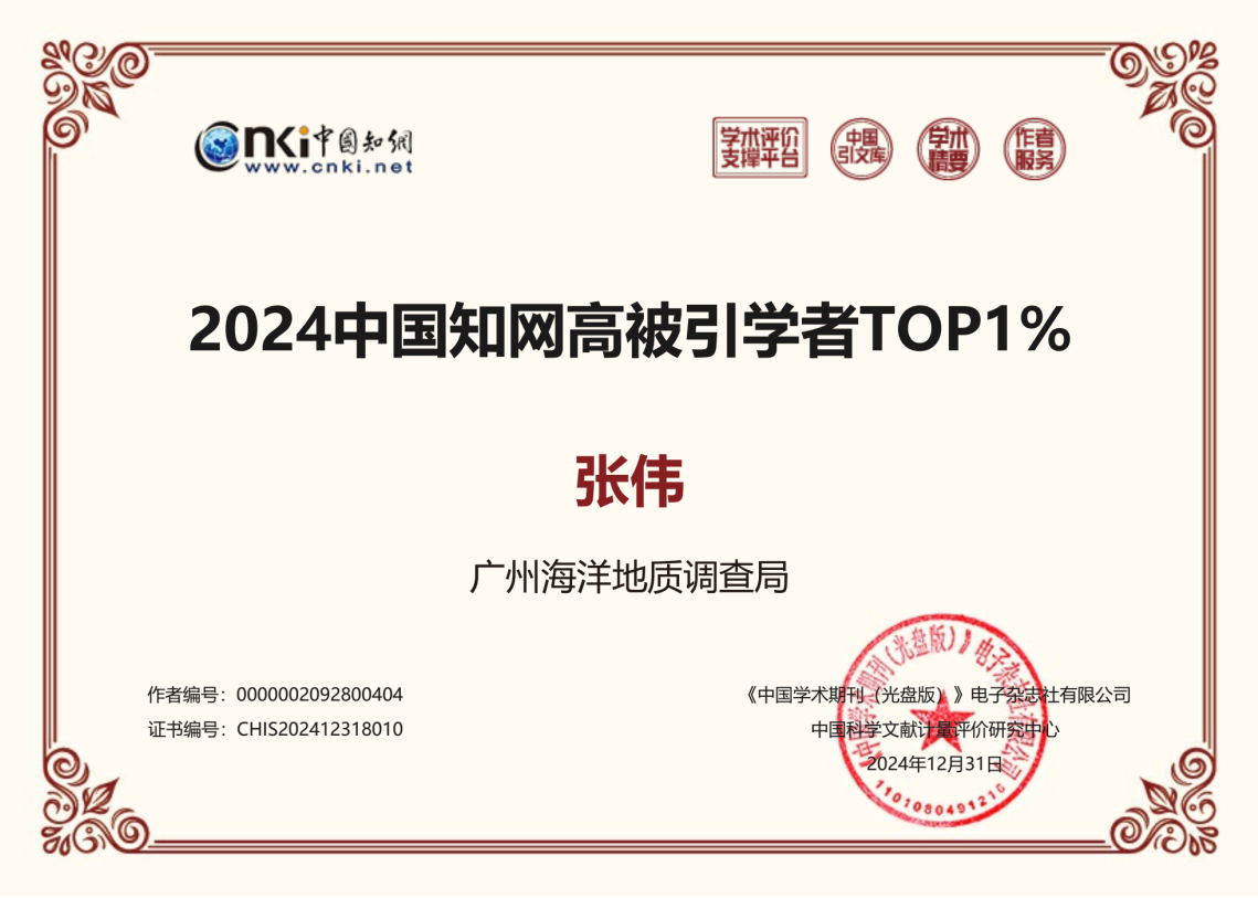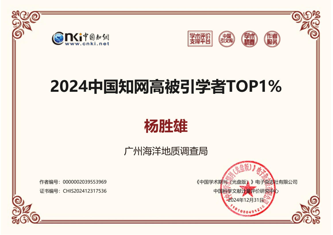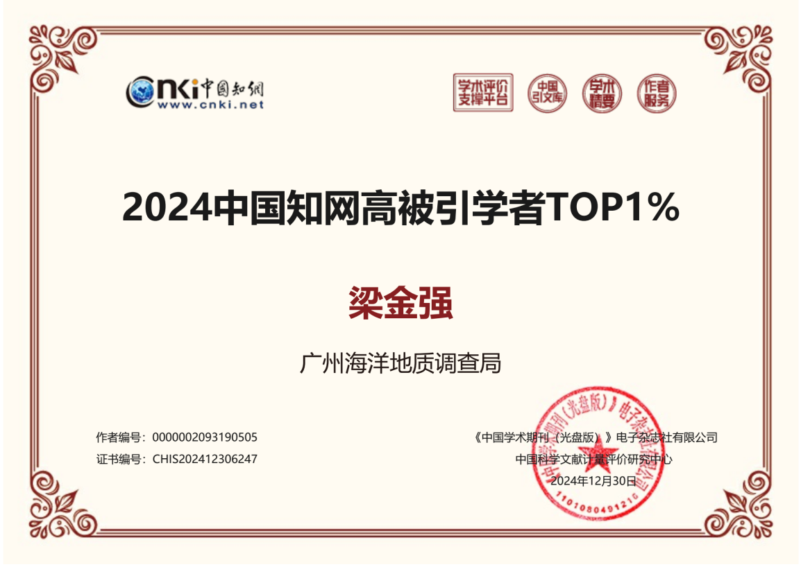 近日,中国知网下属的中国科学文献计量评价研究中心基于中国知网收录的国内学术成果,首次开展学者学术影响力客观评价,遴选了“2024中国知网高被引学者”名单,广州海洋局杨胜雄、梁金强和张伟入选“2024中国知网高被引学者TOP 1%”榜单。