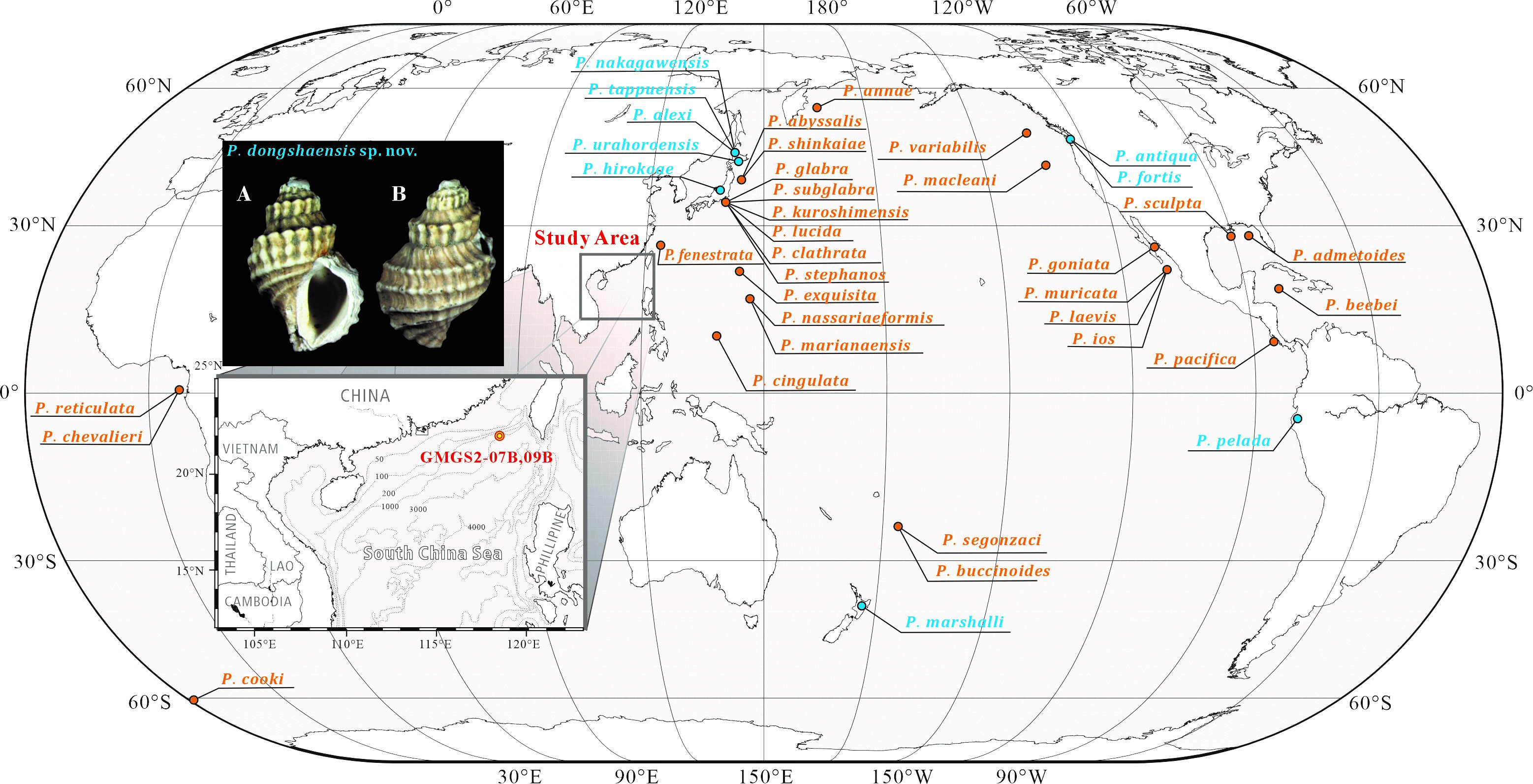腹足类是冷泉化能自养生物群落的主要组成部分(除双壳类外),但目前冷泉尤其是古冷泉腹足类大量物种尚未被发现和描述。Provanna属是全球深海化能合成环境(热液、冷泉)特有的小型腹足动物。目前,该属已知有29种现生种和9种化石种,大多集中分布在环太平洋地区,如日本和美国东海岸。尽管研究海域北部的冷泉沉积物早在2004年就被发现,与冷泉化能自养生态系统相关的软体动物研究成果丰硕,但Provanna属的报道几乎是空白。