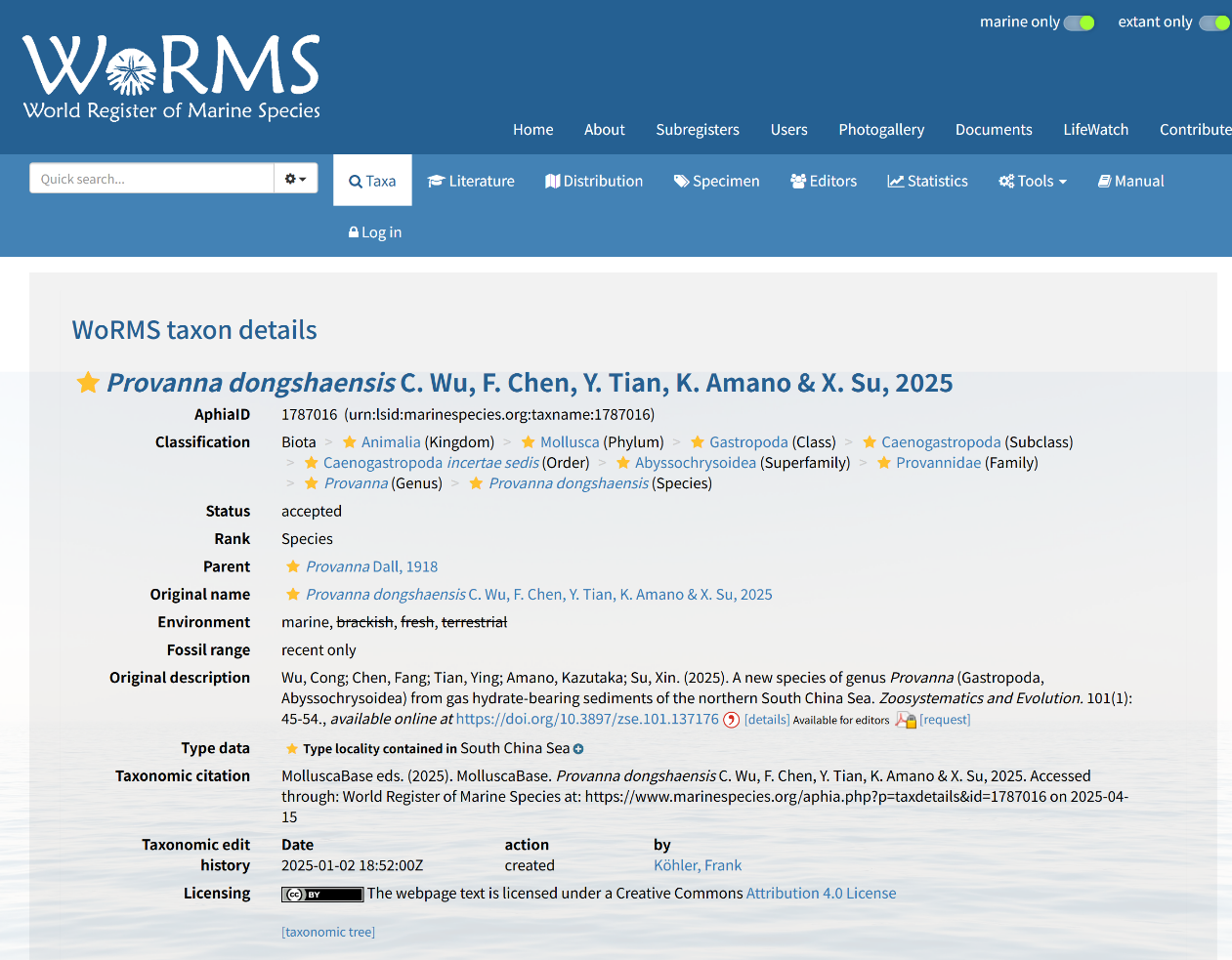 研究正式描述、命名的Provanna dongshaensis,是研究海域北部首次报道的Provanna属化石种,成果发表后即被收录于世界海洋物种名录(WoRMS—World Register of Marine Species)(图2)。此次研究不仅扩展了Provanna属的地理和时间分布范围,丰富了世界冷泉腹足类生物的多样性,还为深海化能合成生态系统的古环境重建提供了新的视角。未来,研究团队计划进一步探索南海北部的冷泉生物,以揭示更多关于深海软体动物多样性和演化的奥秘。