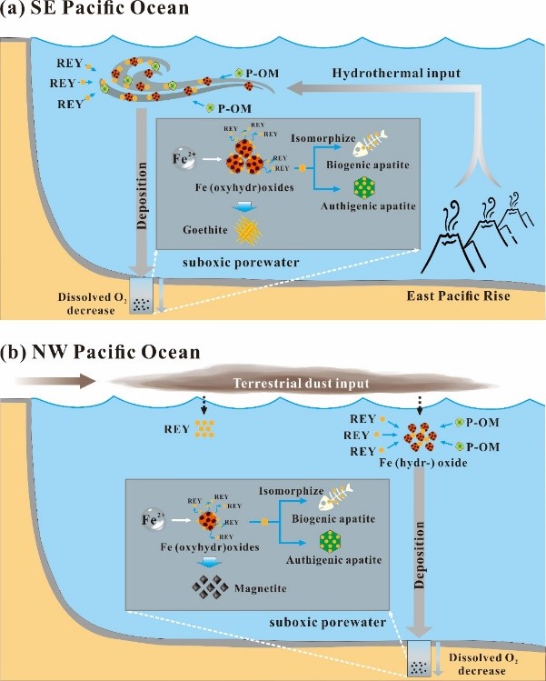 (a) 东南太平洋和 (b) 西北太平洋中由海洋铁生物地球化学循环驱动的深海稀土元素富集概念模型。P-OM:含磷有机物