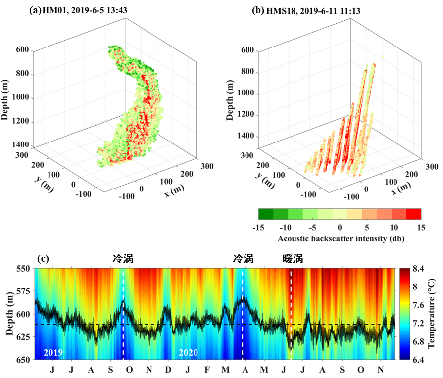 图1. 观测揭示的“海马”冷泉羽状流形态特征。(a)中、深层洋流反向产生的蛇曲型羽状流声学图像;(b)中、深层洋流同向产生的倾斜锥状羽状流声学图像;(c)潜标观测揭示的水合物稳定域上边界深度(黑色实线)时间变化,其显著垂向振荡主要来自中尺度涡的调制作用。