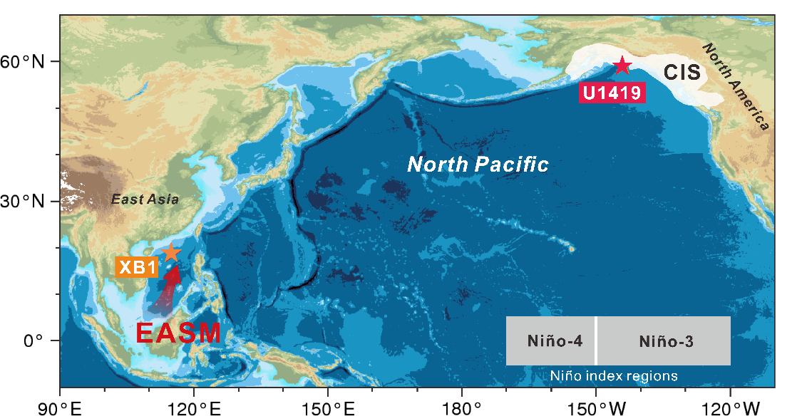 图1.研究区域图。橙色星号为本研究站位XB1,红色星号为站位U1419;红色箭头(EASM)指示东亚夏季风;白色区域(CIS)为科迪勒拉冰盖;灰色方框指示Niño 3.4区域。