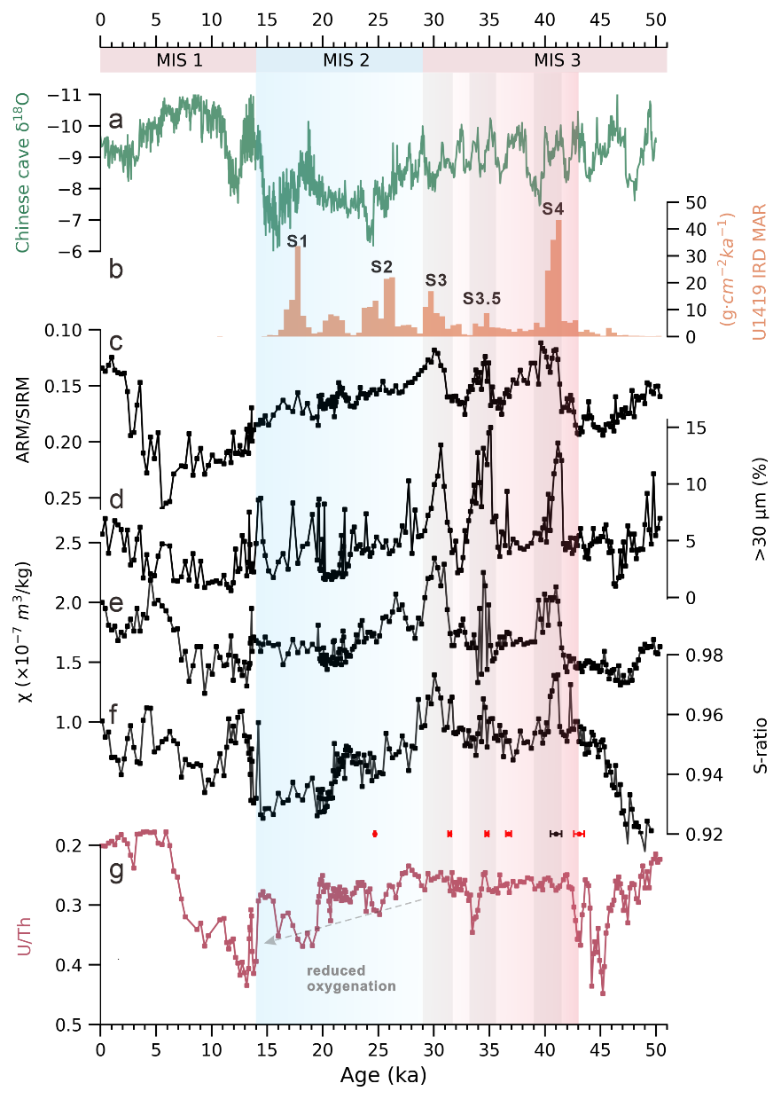 图2.该图整合了过去 5 万年全球气候及南海 XB1 岩芯的多指标数据,在末次冰期的MIS 3阶段(约5万至3万年前),南海沉积物中的磁学指标(如ARM/SIRM比值、磁化率χ)和粒度组分(>30微米颗粒含量)出现了三次显著的峰值变化,这些变化恰好与北美科迪勒拉冰盖的Siku事件(3、3.5和4)在时间上高度吻合。这意味着每当冰盖发生大规模崩解时,东亚夏季风带来的降水显著增强,导致更多陆源碎屑物质被冲刷进入南海。相比之下,在MIS 2阶段(末次盛冰期),还原性成岩作用强烈,原始气候信号被严重改造,无法清晰记录这种高低纬度的联动关系。