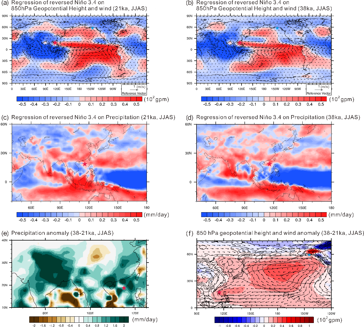图3.气候模型模拟的结果:在38 ka(代表MIS 3)与21 ka(代表MIS 2)的对比中,当热带太平洋处于类拉尼娜状态时,东亚夏季风区域的降水显著增加(增幅约0.66毫米/天),同时北太平洋副热带高压强度增强且位置向极地移动(北移约1.1个纬度)。这种大气环流配置一方面加强了向南海的陆源输入,另一方面促进了向高纬度地区的热量输送,从而为科迪勒拉冰盖的消融和崩解提供了有利条件。模拟结果有力地支持了ENSO作为桥梁,将低纬季风活动与高纬冰盖变化联系起来的机制。