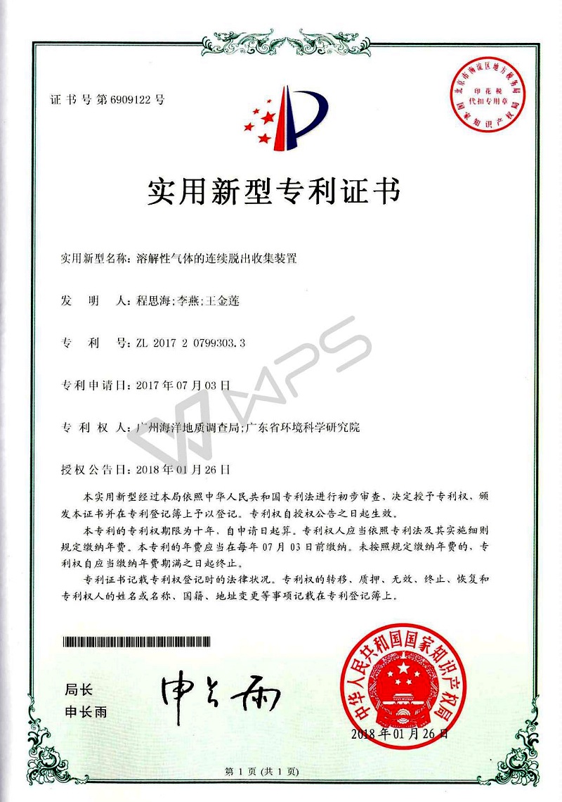 近期从国家知识产权局获悉,由广州海洋地质调查局实验测试所联合广东省环境科学研究院提交的“溶解性气体的连续脱出收集装置”申请,获得国家实用新型专利授权。