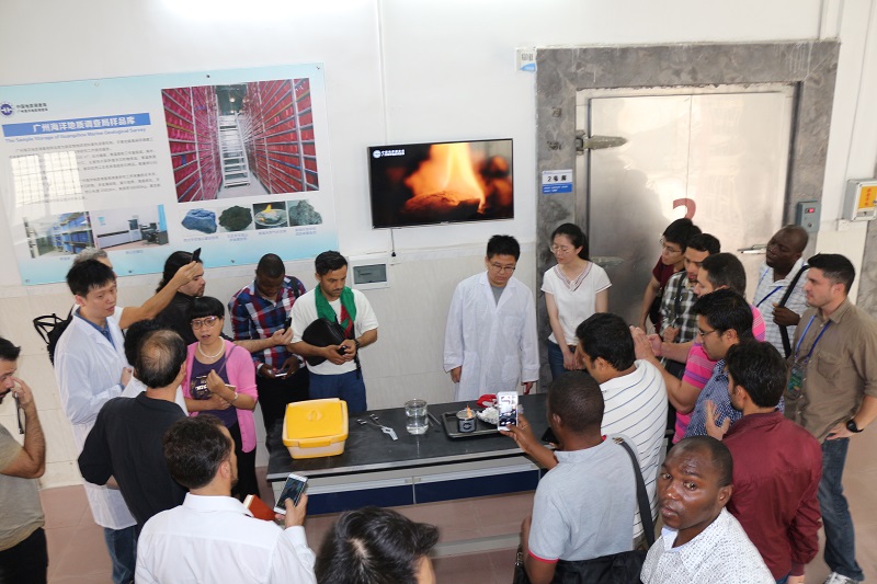 来自孟加拉、蒙古、委内瑞拉、坦桑尼亚等12个国家的25名能源资源领域的官员和技术人员参加了本次研修与培训。广州海洋局专家先后介绍了局情、海域天然气水合物勘查试采进展与成果、天然气水合物勘查地球物理和地球化学技术方法、ROV装备研发及应用;技术人员带领学员参观了广州海洋局样品库、实验测试仪器、海洋高技术研发设备、地质资料磁带库和计算机机房,并对这些仪器设备优势及在海洋地质领域的应用和广州海洋局地质地球物理资料处理技术方法、资料管理和机房维护工作流程进行介绍。最让学员们兴奋的是有机会现场观看到天然气水合物点火、水合物试采沙盘和登上“海洋地质十号”船参观。