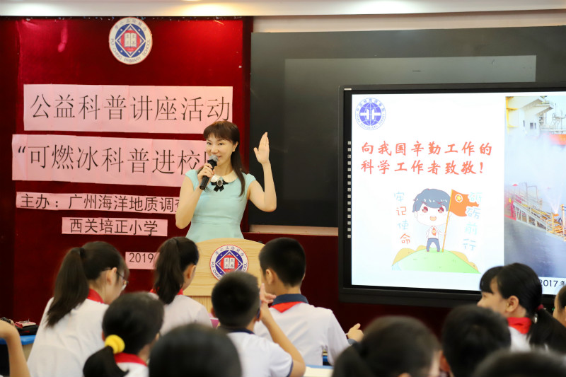 这次的科普讲座,由水合物技术中心萨日娜博士主讲,她生动形象地向西关培正小学的同学们讲述了来自大自然的宝藏--“可燃冰”,什么是“可燃冰”,“可燃冰” 究竟有多厉害、“可燃冰”都藏在哪、海上的“可燃冰”分布、如何寻找“可燃冰”、我国南海“可燃冰”分布情况、我国“可燃冰”勘查试采情况、放大后的可燃冰等等,并与同学们一起回顾了2017年广州海洋局首次“可燃冰”试采的艰辛历程,分享了成功的喜悦......这些都激发了同学们对“可燃冰”的热情,增进青少年对海洋科技的热爱。