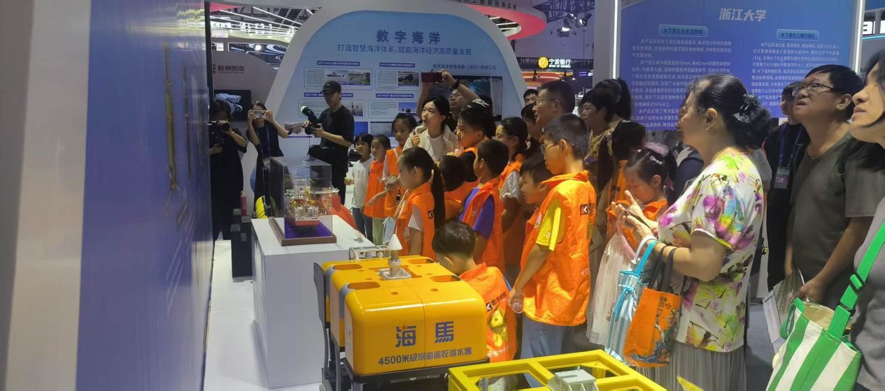本届全球数字贸易博览会设置了1个主题展馆和7个特色产业展区,展览展示总面积达15.5万平方米。广州海洋局“梦想”号大洋钻探船、“海马”号深海无人遥控潜水器(ROV)等模型以及自主研发的低频宽带海底地震仪(LB-OBS)实物展品在人工智能馆的智能海洋产业展区内展出。生动的高精度比例模型和极具特色的装备实物引人注目,吸引众多海洋地质调查领域同行交流探讨和大小朋友们积极互动,成为展区内的热门打卡点。科研人员向观众介绍了“梦想”号大洋钻探船的科学功能,描述了“海马”号ROV的应用场景,讲解了LB-OBS的工作原理和技术优势,为观众带来了沉浸式海洋科技体验。