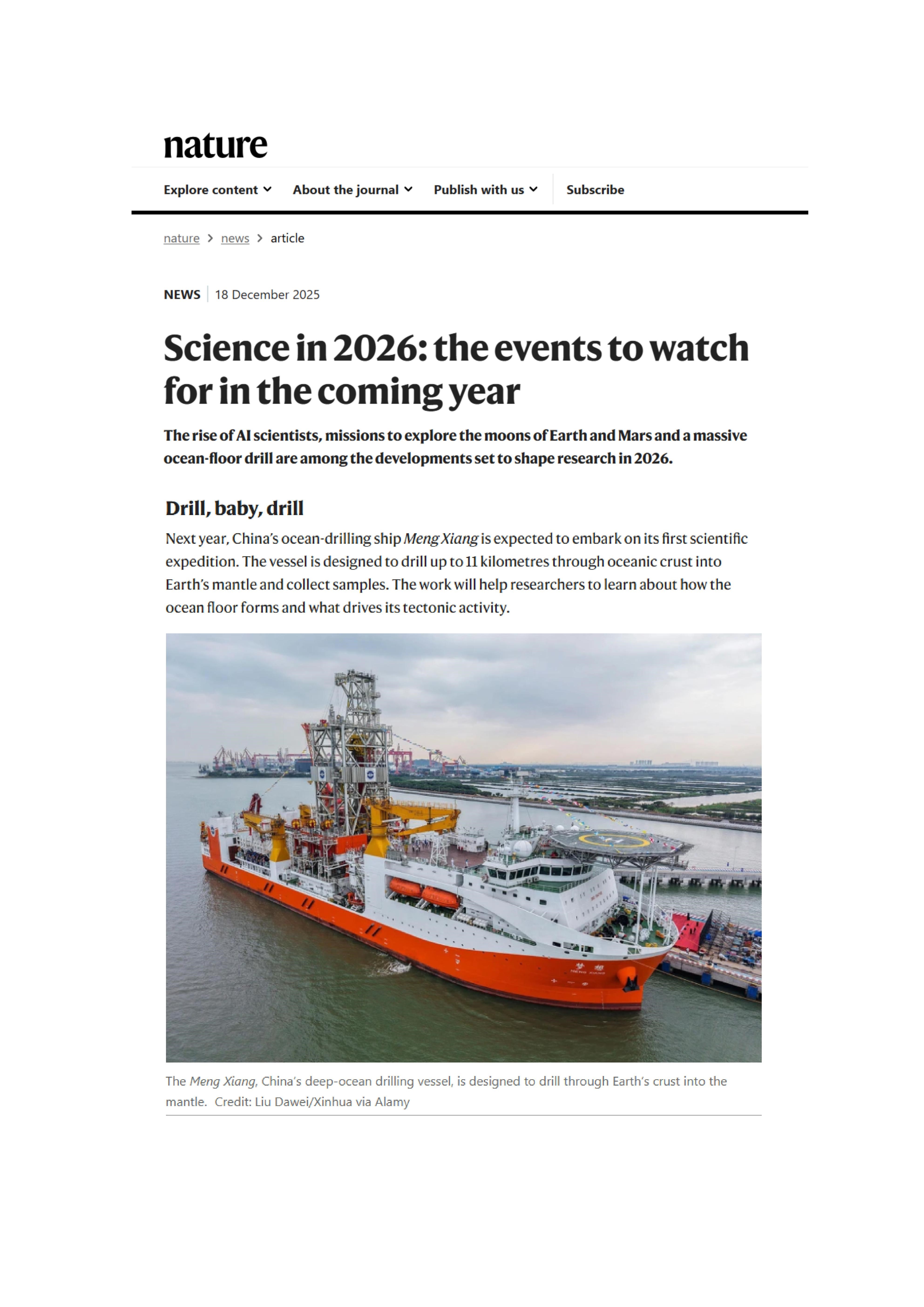 近日,国际顶级学术期刊《自然》(Nature)发布了题为“2026年科学展望:未来一年值得关注的大事件”的前瞻报告,展望了2026年全球科学领域值得关注的七项重要事件。其中,“梦想”号大洋钻探船科考任务入选。