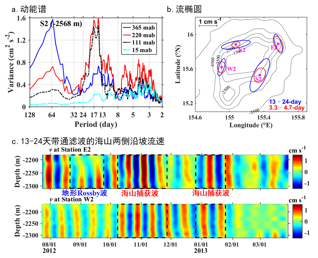 基于低纬度西太平洋采薇海山4套潜标观测,研究团队发现了海山斜坡同时存在13–24天、3.3–4.7天周期的间歇性海山捕获波与地形罗斯贝波。观测的海山捕获波表现为:海山两侧水平流呈现一对绕海山顺时针传播的反向旋转偶极子,海山两侧方位流速(温度)位相相反。而当次惯性时间尺度的强能量仅出现在海山一侧时,表征为地形罗斯贝波,其垂向捕获尺度为192–379 m,波长为14–28 km。数值模拟表明采薇海山次惯性海山捕获波主要表现为高模态:13–24天周期海山捕获波对应方位波数为1、径向-垂向模态为5,而3.3–4.7天周期海山捕获波对应方位波数为3、径向-垂向模态为3。上层中尺度扰动可以为海山捕获波和地形罗斯贝波提供能量,而扰动的空间尺度以及作用到海山的空间范围决定了是激发海山捕获波还是地形罗斯贝波。