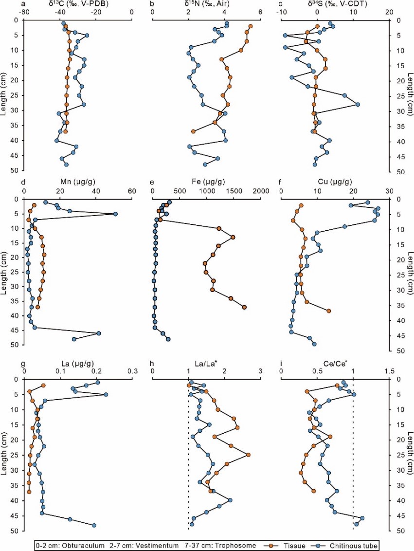 Jia, Z., Li, N.*, Peckmann, J., Wang, X., Feng, J., Zhuo, B., Cui, N., Kuang, Z.* (2025a). Geochemical fingerprinting of siboglinid tube worms: Insights from stable isotopes (C, N, and S) and trace elements. Journal of Geophysical Research: Oceans, 130, e2024JC022177.-成果1