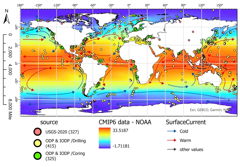 研究团队揭示了海底甲烷渗漏与洋流之间的正相关性,在大尺度上识别出与海洋动力过程相关的渗漏群集(甲烷渗漏显示显著的空间聚类),尤其是在近岸大陆架、环太平洋和环大西洋观察到多个高密度中心。并且发现洋流可以通过温度梯度、压力变化和水团交换影响甲烷渗漏。约42% 的海洋甲烷渗漏发生在暖流和冷流交汇辐射范围,典型例子包括墨西哥湾流与北大西洋洋流的交汇区等。