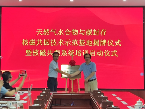 为深入推进“产学研用”科技合作,加快提升科技创新能力,更好地利用广州海洋地质调查局引进的大型低场核磁共振系统,天然气水合物勘查开发国家工程研究中心(以下简称“国家工程研究中心”)联合苏州纽迈分析仪器股份有限公司(以下简称“苏州纽迈”)共同成立“天然气水合物与碳封存核磁共振技术示范基地”(以下简称“示范基地”)。近日,示范基地揭牌仪式暨核磁共振系统培训启动仪式在广州海洋地质调查局南沙科研基地举行。广州海洋地质调查局副局长、国家工程研究中心总工谢文卫,苏州纽迈董事长杨培强共同为示范基地揭牌。