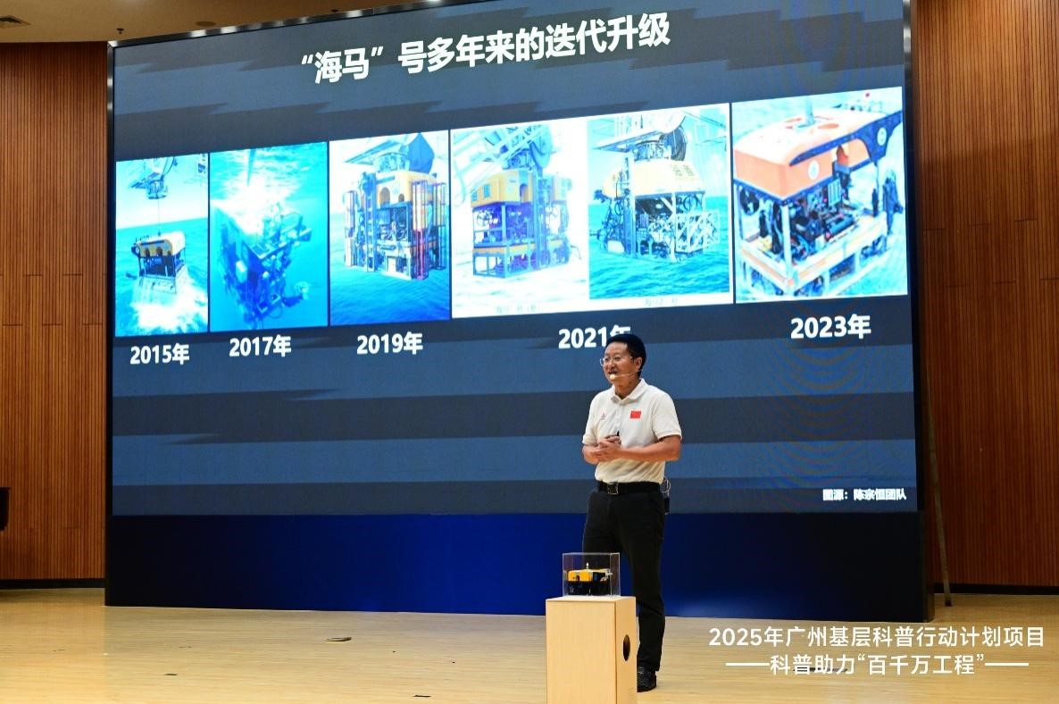 近日,广州海洋局方法所副所长、教授级高级工程师陈宗恒应邀在广州市南沙区湾区实验学校参加广州基层科普行动计划—科普助力“百千万工程”暨新质生产力“水下机器人”专场活动,并作专题报告。
