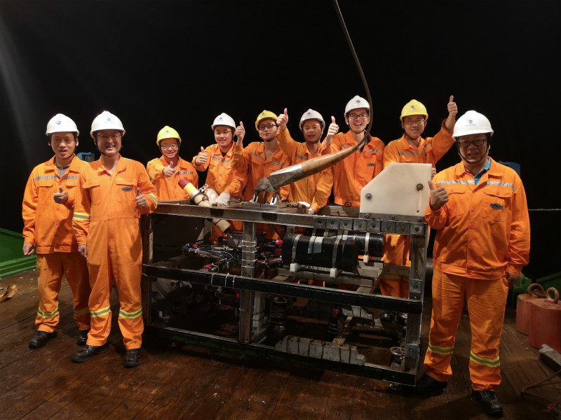 “海洋六号” 工作人员在深海摄像前合影,庆祝航次任务完成
