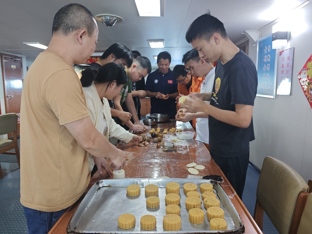 10月6日下午两点多,餐厅里香气弥漫。我们围在长桌旁,开始了手工月饼制作。面粉、油糖、豆沙馅料摆了一桌。我们这些平日里操纵设备仪器、与海洋打交道的手,此刻却有些笨拙地倒腾着面团。揉面、包馅、压模,当印着“平安”“花好月圆”字样的月饼从模具中磕出时,笑声也在空气中飞扬。场面固然是热闹的,只是每个人眼中会闪过一丝不易察觉的思念。仿佛大家做的不只是月饼,而是能把胃和心都熨帖得暖暖的“乡愁解药”。