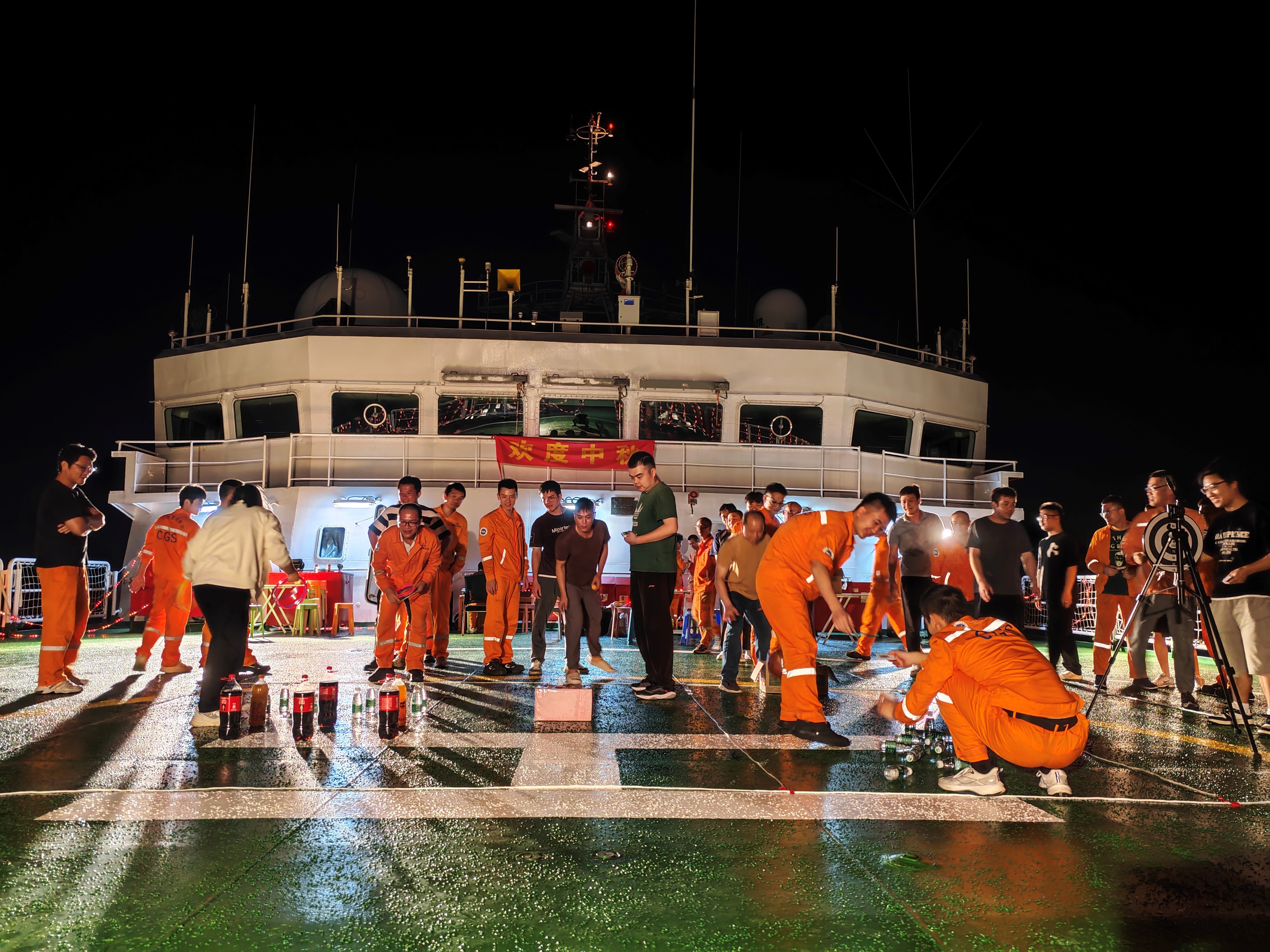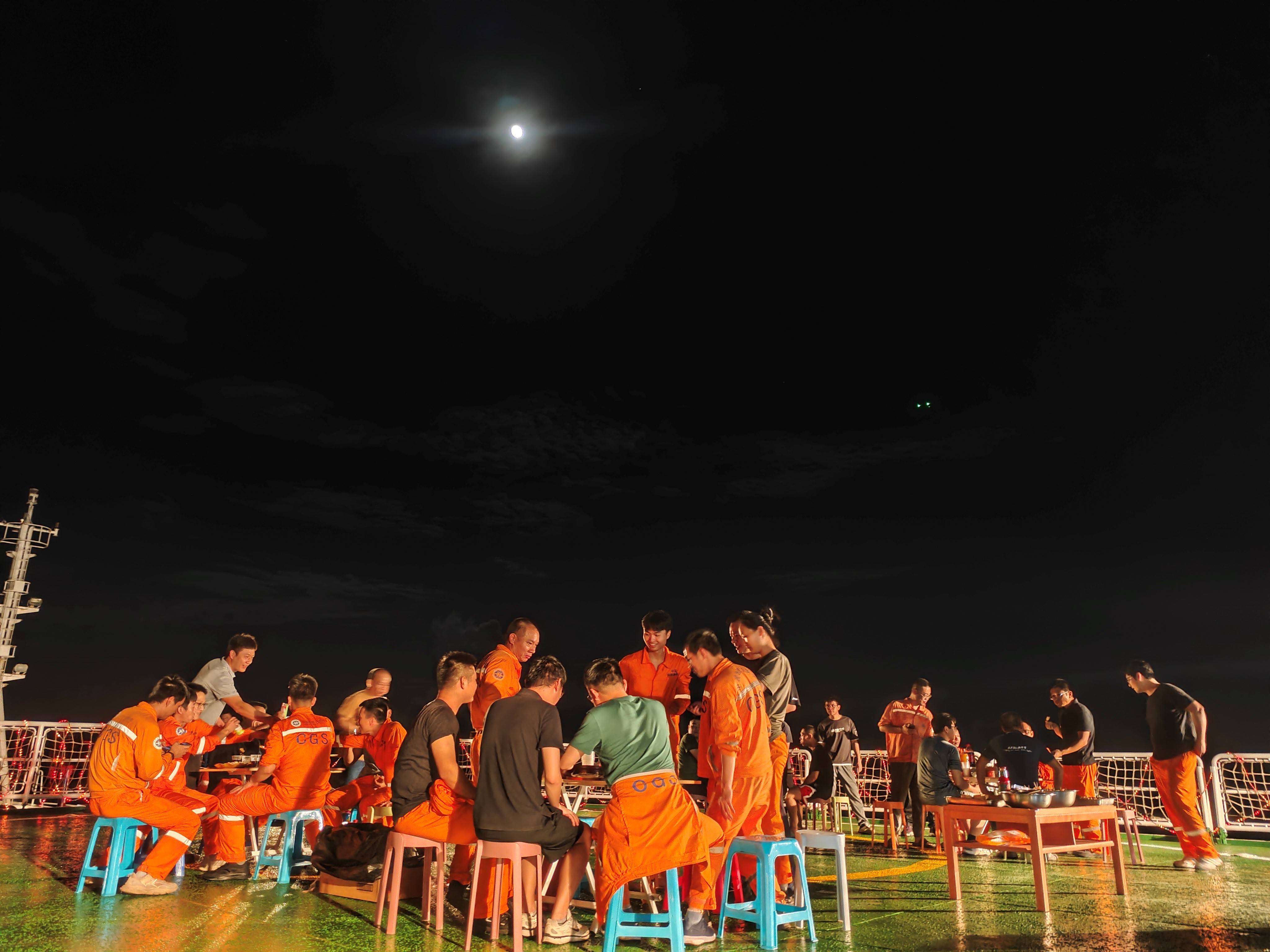随着太阳没入太平洋的海平面,广阔海面上那粼粼波光渐渐褪去。洁白又圆满的月亮挂在夜空中,柔和的清辉洒满深海大洋。在这中秋的月圆夜里,“海洋地质六号”科考船上每人心中那积攒许久的思念和期盼,泛起丝丝涟漪、经久不绝。在太平洋的工区,这群远离陆地的人,正用他们特有的方式,庆祝着这个“团圆”的节日。